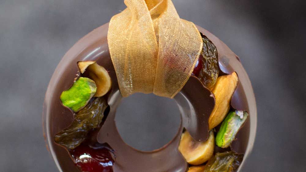 Use a silicon ring or silicon doughnut mould and place all the fruit and nuts in the base. Pipe the prepared chocolate on top and place it in the fridge for 10 minutes to set.