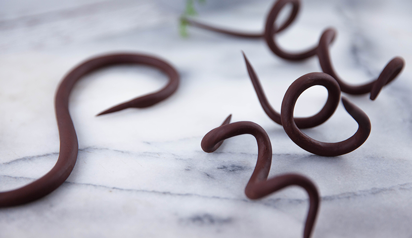 Finely chop a block of dark chocolate and place it in a food processor. Mix until you achieve a smooth pliable paste. If creating a large volume of twigs, bring the chocolate to a crumb texture, remove it from the food processor and place small amounts at a time back into the food processor to bring to a paste.
