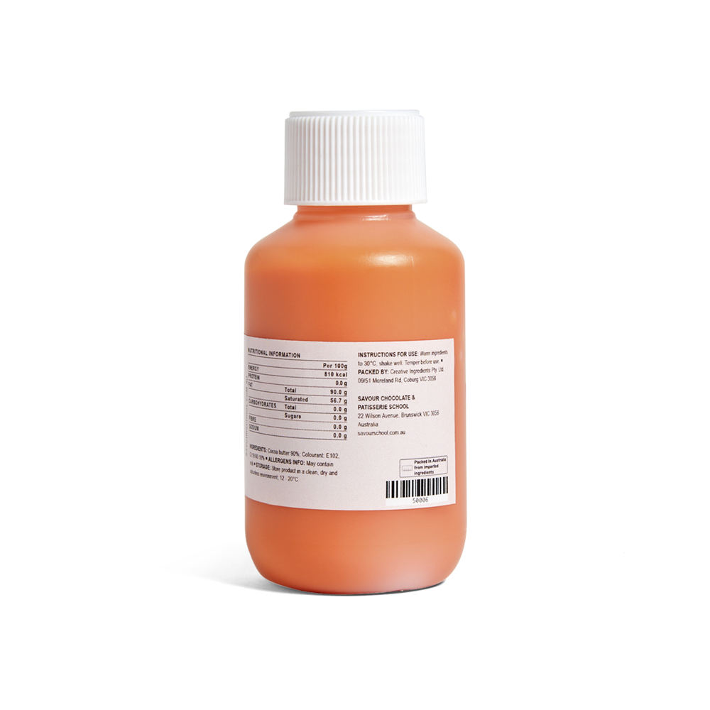 Our pre-made cocoa butter range is made with Callebaut cocoa butter and oil soluble colours.Perfect for decorating chocolates, chcolate moulds and transfer sheets.  Simply place the sealed bottle in a hot water bath and cool to 31C before applying to your mould or product.  Shake well before use. If using with a spray gun, keep temperature between 30-33°C. Ingredients: Cocoa Butter, Yellow Coloured Powder (E102)