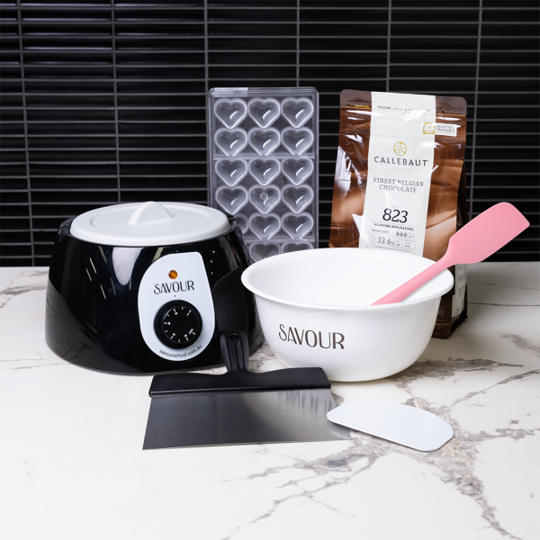 A great kit for the home enthusiast who loves to create chocolates and bon bons on a regular basis. This handy kit includes a 1.8l Mini melting tank, Savour silicon spatula, dough scraper for testing your tempered chocolate and a 2.5l tempering bowl. Also included is , a professional chocolate scraper to make light work of scraping your moulds, and 1kg of Callebaut's 823 milk chocolate.