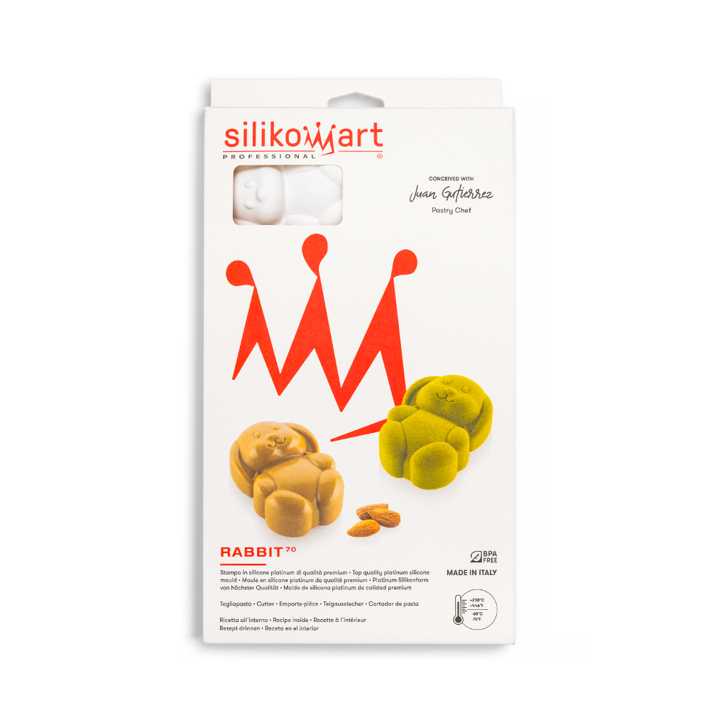 Created in collaboration with chef Juan Gutierrez, the Rabbit 70 mould allows you to make 8 bunny-shaped single portions of 70 ml each, ideal for mousses, semifreddos and baked creations. The mould includes a custom-designed cutter to create perfect bases or inserts that enhance the three-dimensionality and flavour of your preparations.