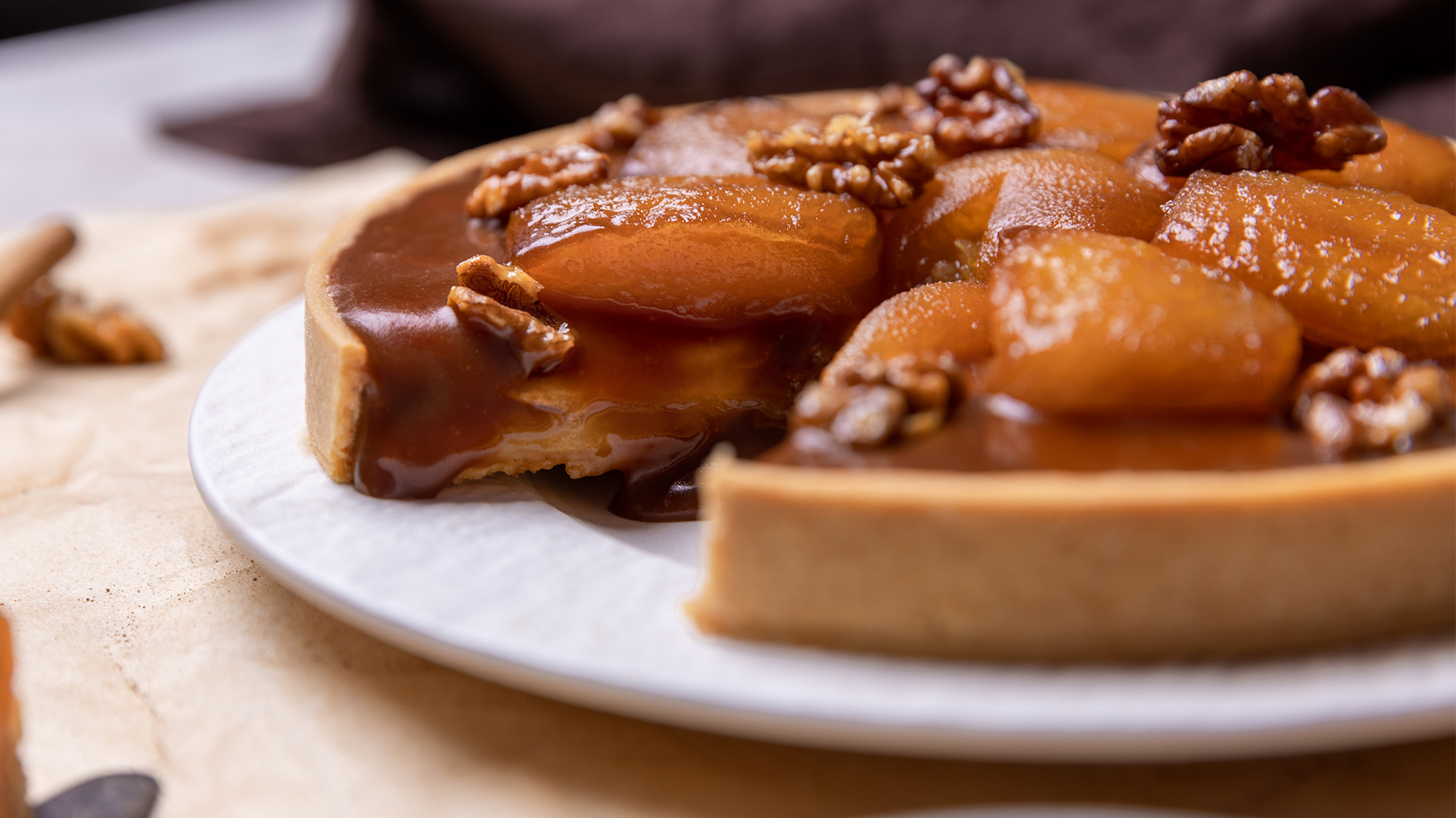 A crisp shortbread pastry tart shell filled with layers of vanilla cake, sauteed apples, delectable caramel and crunchy candied walnuts.