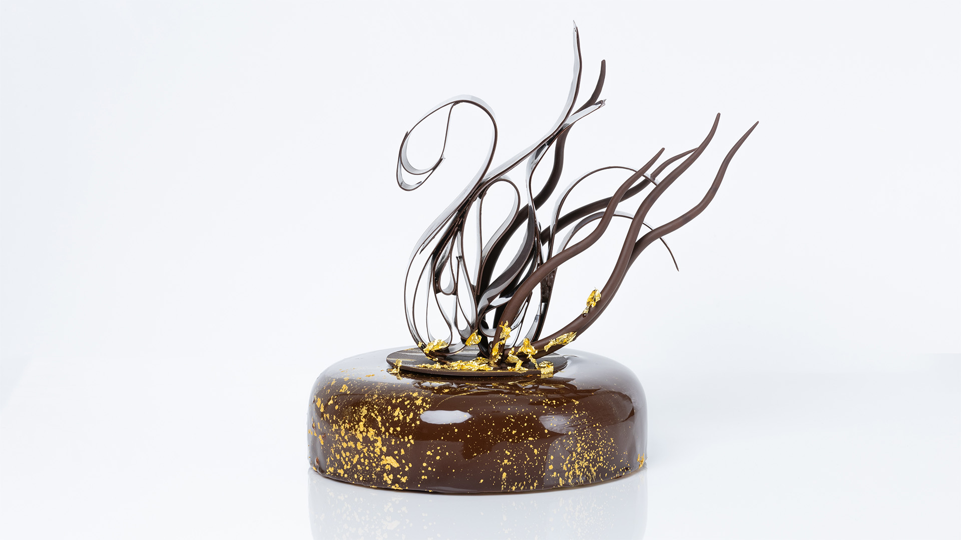 Layers of delicious chocolate pain de gene, caramelised puffed rice chocolate crunch, salted caramel and Champagne jelly encased in a lush vanilla bavarois. The show-stopper is finished with a dark, shiny glaze speckled with gold and an impressive chocolate swan garnish.
