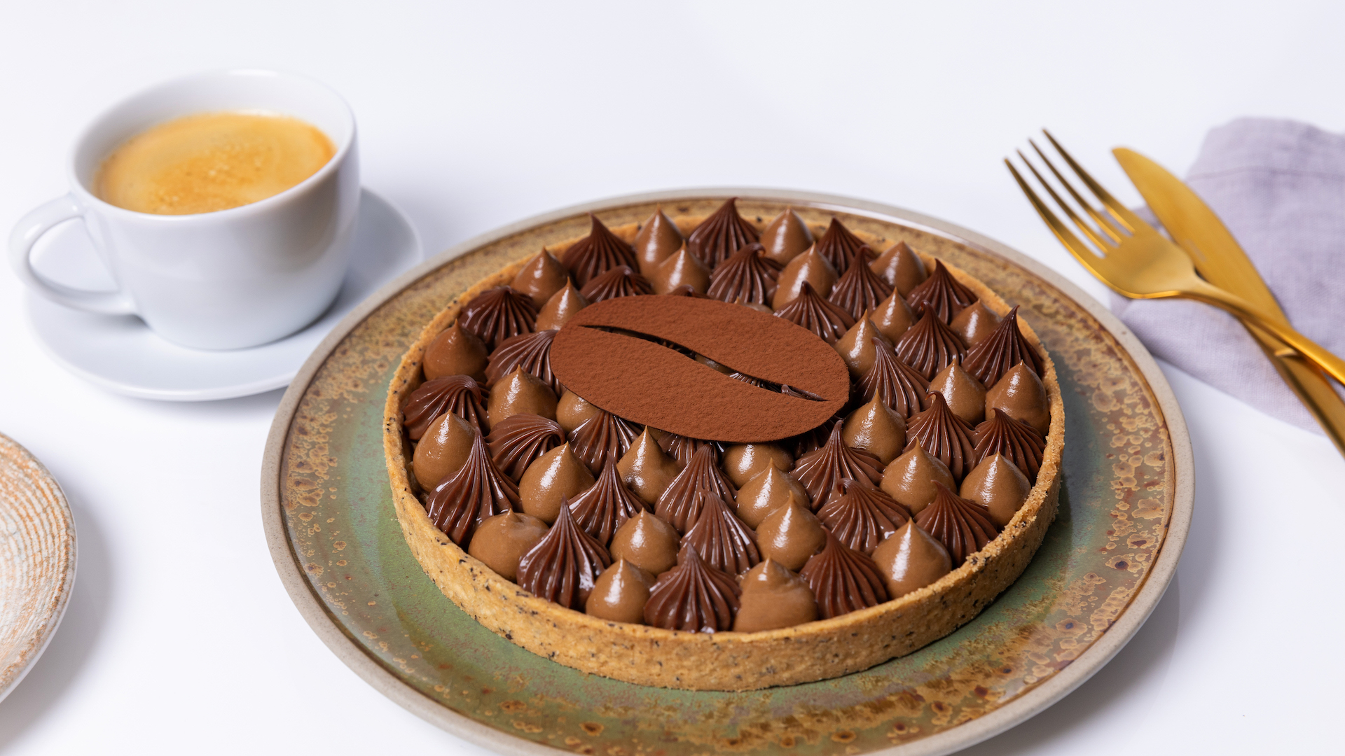 The buttery, crumbly coffee shortbread tart shell is lined with white chocolate macadamia crunch, then filled with chocolate cremeux and whipped caramel. For added 'impressive' points, top with a handsome, hand crafted chocolate cocoa bean garnish.