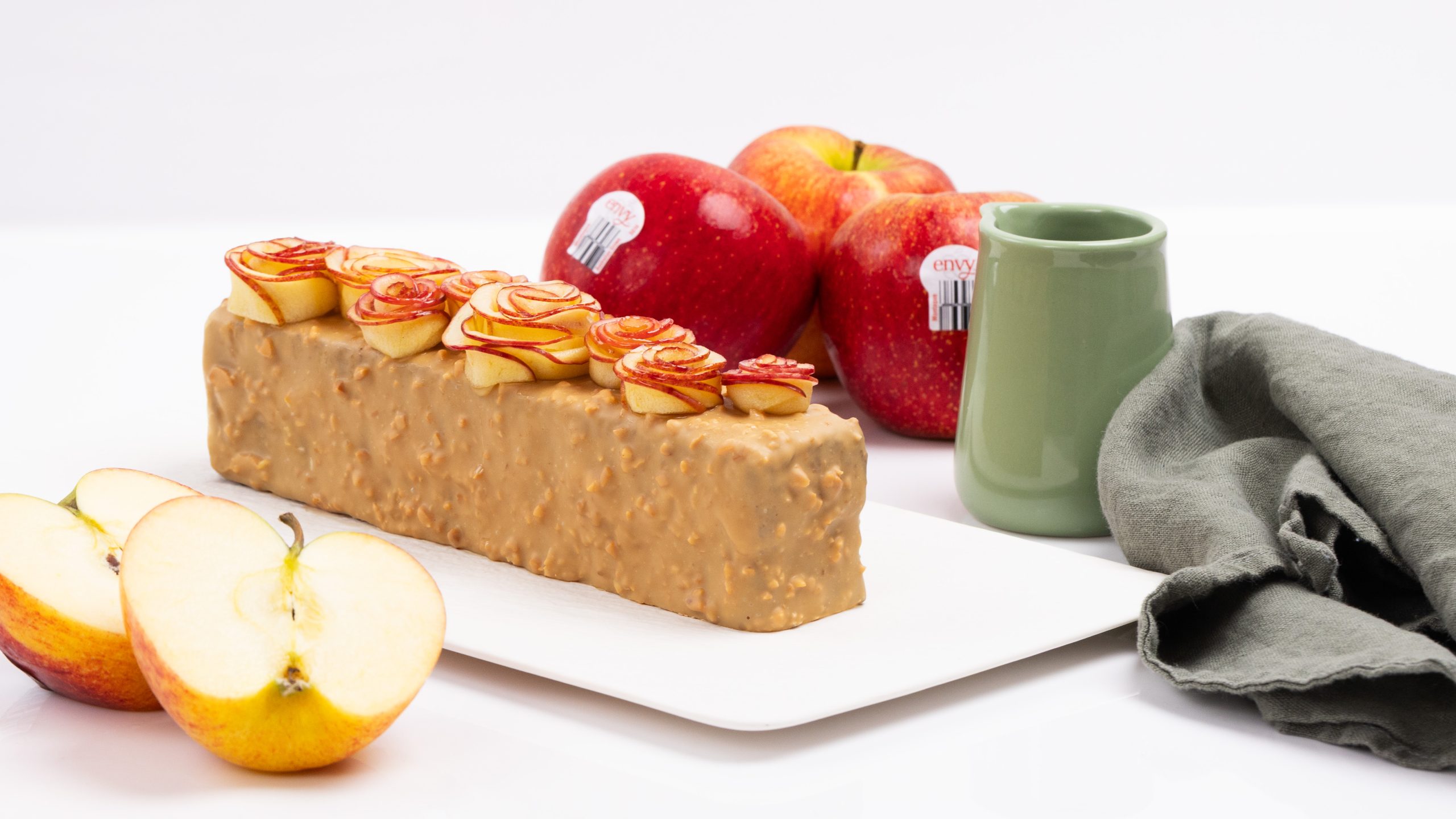 This beauty isn’t just your run-of-the-mill apple cake. It’s an envy™ apple and almond praline cake with a surprise hit of caramel, coated in a divine gold caramel chocolate and almond glaze. And to top it all off? Gorgeously crafted apple roses.
