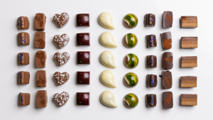 The creamy white chocolate-coated cone is decked out with delicate silver-flecked meringue kisses, swirly white-and-green coconut truffles, and cheery chocolate bells.