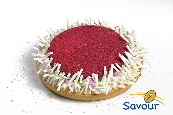 Spread the crunchy almond mixture before it sets into the base of the tart and then place in a layer of fresh raspberries. Pipe the prepared rose cream on top with a 10mm piping tube. Place the prepared chocolate disc covered with the freeze dried raspberries on top of the rose cream and then place the prepared meringue discs around the side. Garnish with the pistachios and crystalized rose petals.