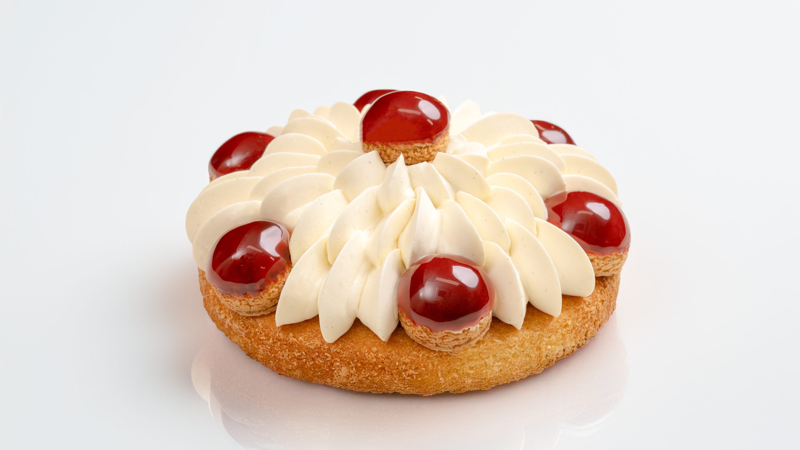 Craquelin-coated choux buns filled with luscious vanilla pastry cream and glazed in a deep glossy red, sitting proudly atop a soft vanilla and coconut cake. With some additional pastry cream, fresh raspberries, and the most elegant Saint Honore piping of white chocolate Chantilly cream, you’ve got yourself a dessert that’s equal parts fancy and fun.