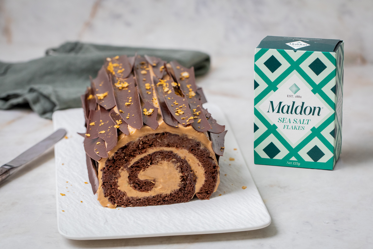 A sweet creation perfectly harmonised with Maldon Sea Salt. Salted caramel chocolate cream and crunchy roasted hazelnuts rolled in an airy chocolate sponge, then finished with rich, dark chocolate shards and gold sea salt.